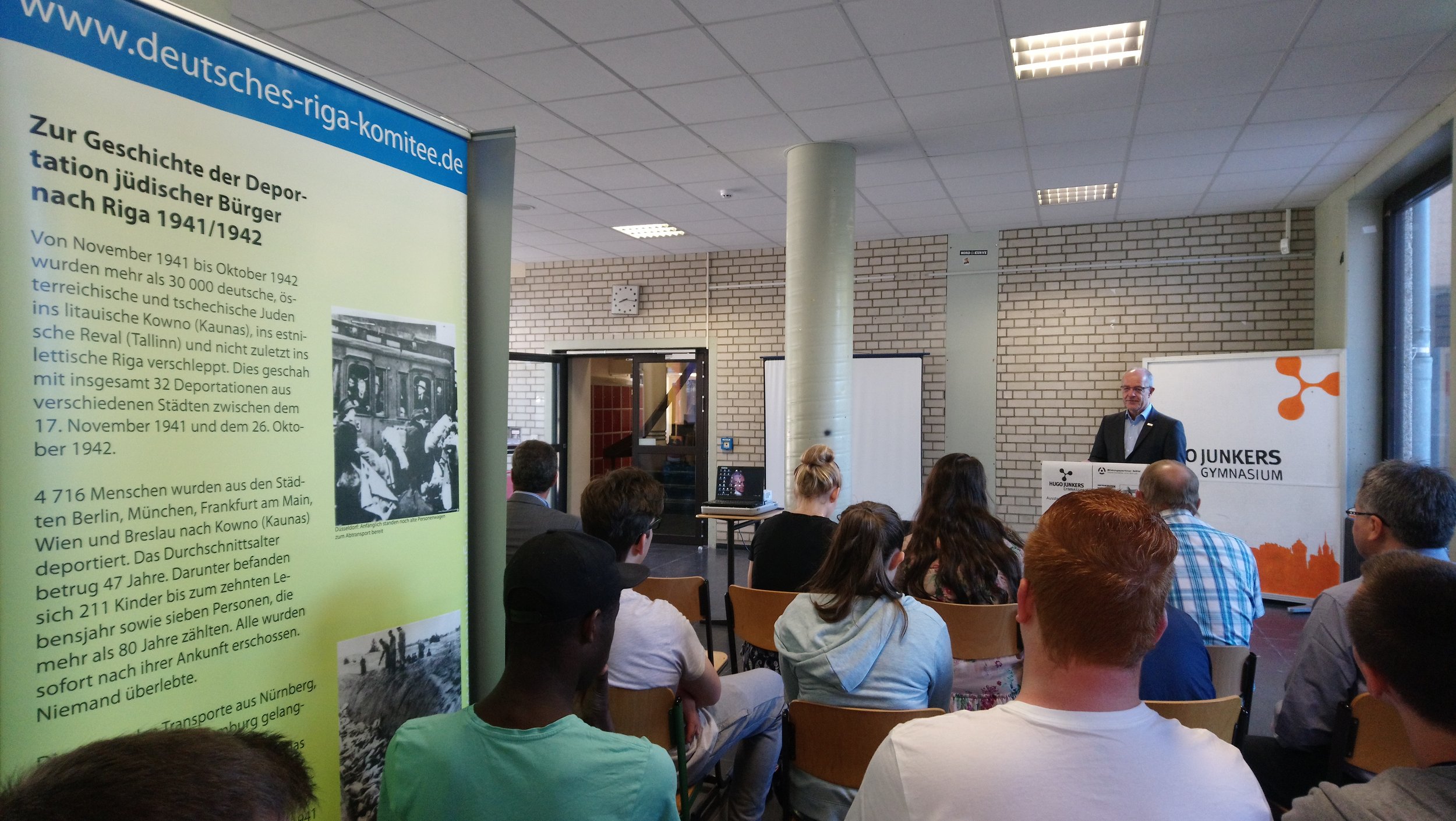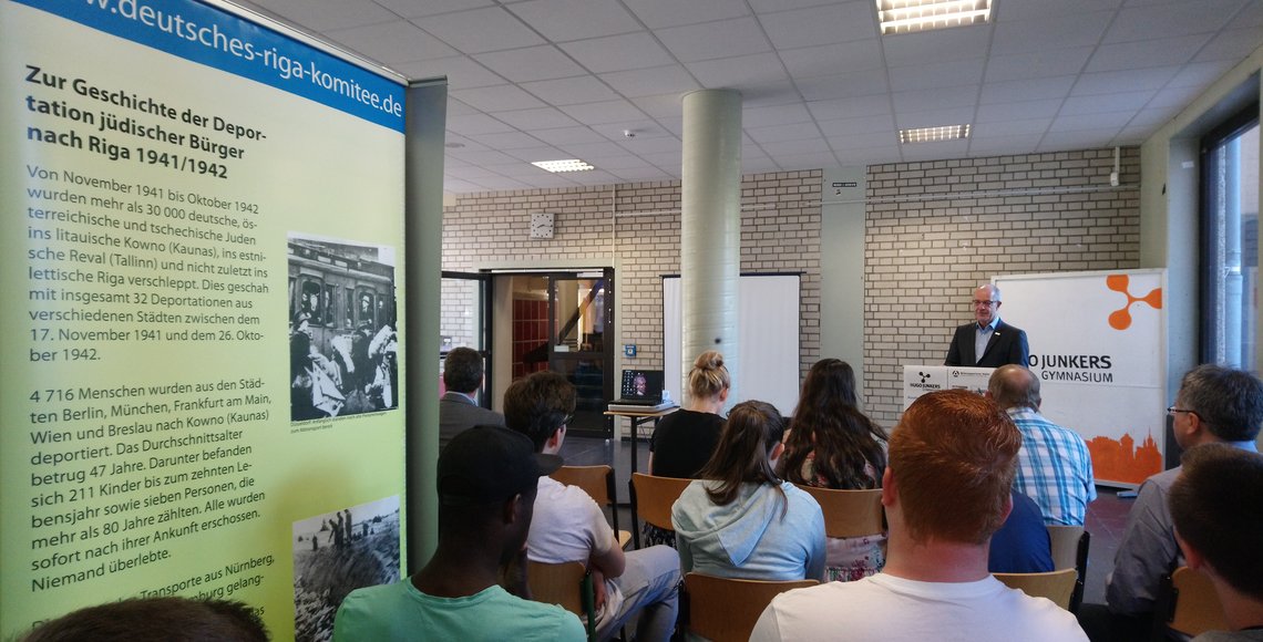 Oberbürgermeister Reiners betonte noch einmal, wie wichtig ihm dieser Schritt der Stadt sei, dem Komitee beizutreten. Immerhin seien im Dezember 1941 auch zahlreiche jüdische Bürgerinnen und Bürger aus dem heutigen Mönchengladbacher Stadtgebiet vom Schlacht- und Viehhof in Düsseldorf-Derendorf nach Riga transportiert worden; die meisten haben die Zeit im Rigaer Ghetto nicht überlebt. Dieser Teil der Stadtgeschichte dürfe nicht in Vergessenheit geraten. Dies sagte er nicht nur als Vertreter der Stadt, sondern auch in seiner Funktion als Vorsitzender des Kreisverbands Mönchengladbach im Volksbund und ebenso aus privatem Interesse. An die Schüler*innen gerichtet betonte er noch einmal, dass ihm bewusst sei, wie schwierig ein Zugang zu Geschehnissen sei, die mittlerweile 77 Jahre zurückliegen. Doch genau deshalb freut er sich, dass am Hugo-Junkers-Gymnasium Zugänge zu diesem Thema geschaffen werden.