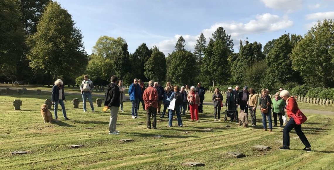 Zum Schluss begab sich die Gruppe zur Kriegsgräberstätte für die Toten aus den Konzentrationslagern. Auf dieser Anlage sind 52 Essener Bürger bestattet, die in Konzentrationslagern ums Leben gekommen sind. Hier liegen Menschen, die aufgrund ihrer politischen Einstellung oder ihrer Lebensweise von den Nationalsozialisten verfolgt wurden. Darunter befinden sich politisch Verfolgte, wie Mitglieder der Kommunistischen Partei Deutschlands, Homosexuelle, Zeugen Jehovas, Sinti und Roma, Wehrmachtsdeserteure und Menschen, die als sog. „Berufsverbrecher“ oder „Asoziale“ verfolgt wurden. Als NS-Verfolgte haben sie alle Anspruch auf ein Kriegsgrab. Die Urnen der Toten wurden in den 1950er Jahren aus den Familiengrabstätten auf diese neu geschaffene Gedenkanlage überführt. Seit 2016 erforschen Schülerinnen und Schüler im Rahmen des Projekts „Wenn nur noch Steine bleiben“ die Biografien der der Toten.