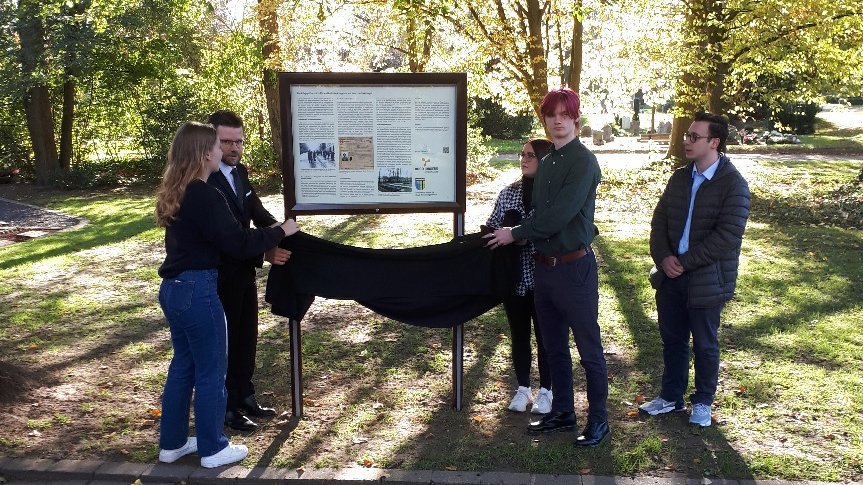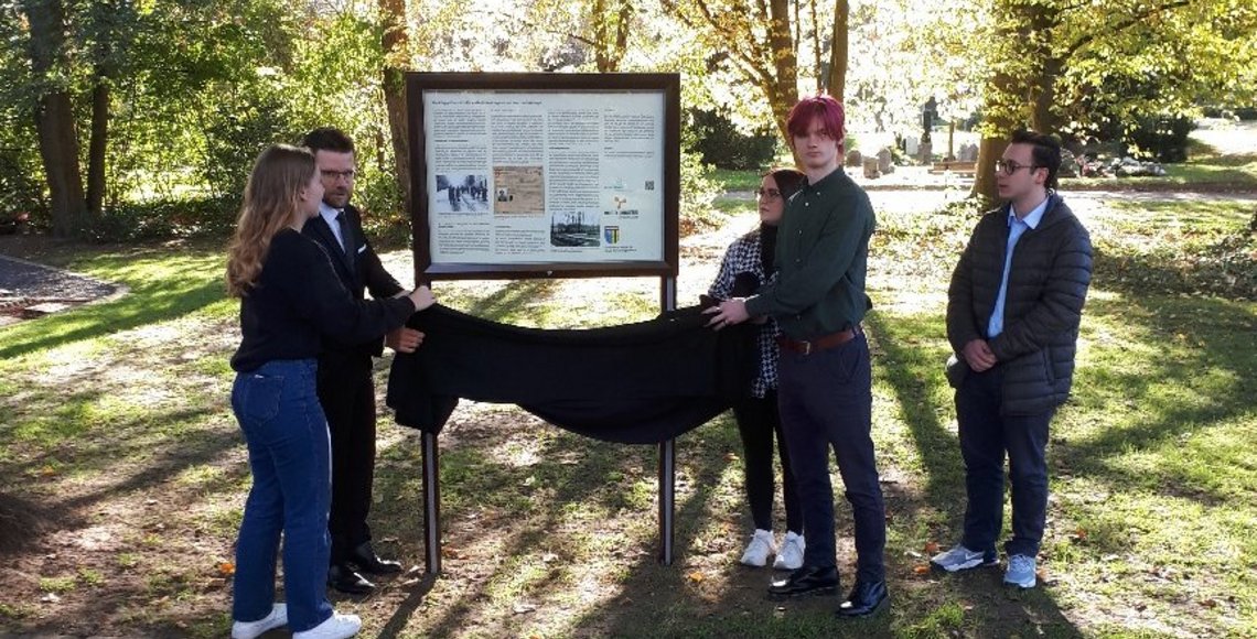 Mönchengladbach. Am Volkstrauertag 2022 enthüllten die Schülerinnen und Schüler des Projektkurses „Erinnern, Verantwortung und Frieden“ des Hugo-Junkers-Gymnasium gemeinsam mit Oberbürgermeister Felix Heinrichs eine Informationstafel zum Kriegsgräberfeld auf dem Friedhof Preyerstraße in Mönchengladbach-Rheydt.